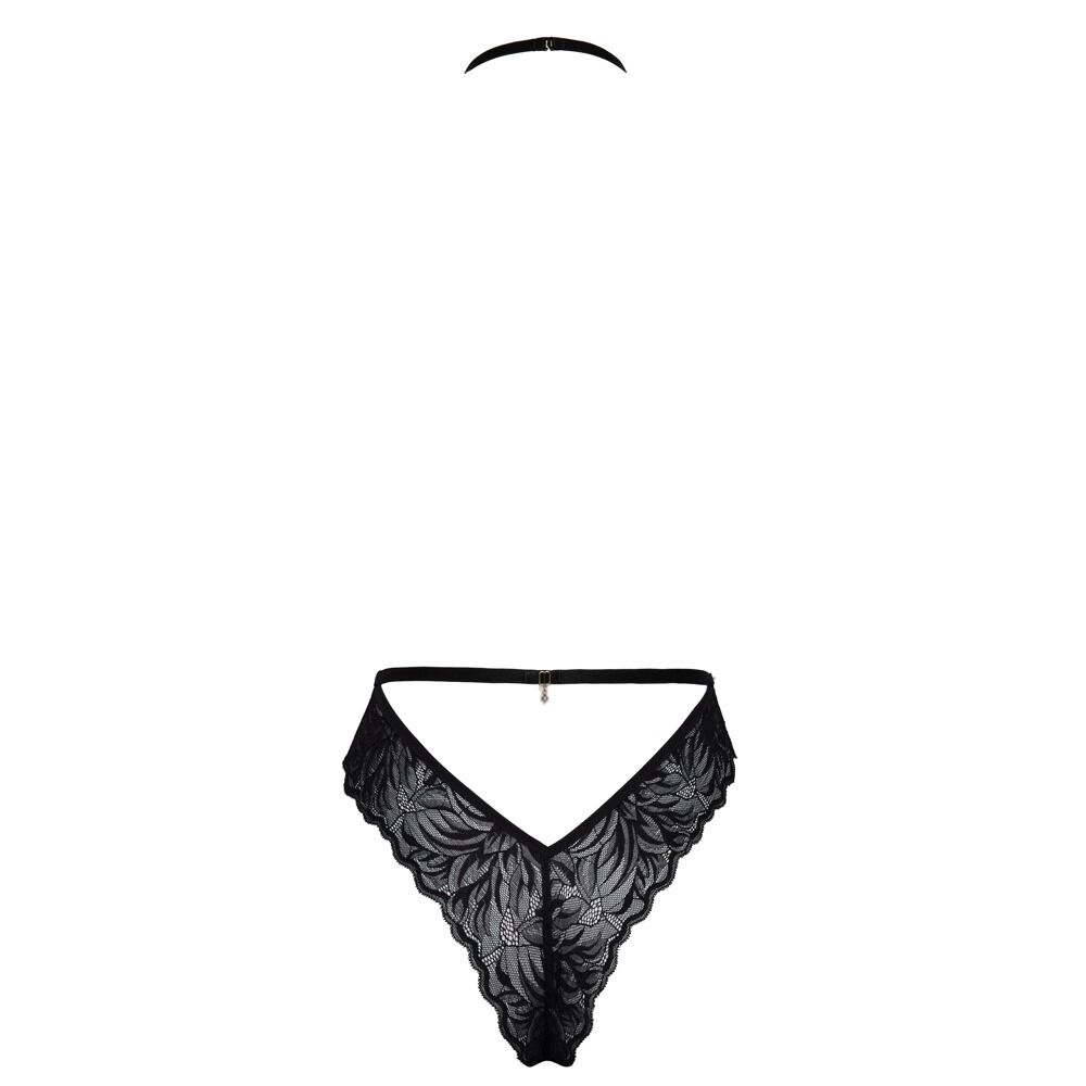 Κατασκευασμένο εξολοκλήρου από λεπτή δαντέλα, αυτό το σέξι body διαθέτει διακοσμητικά glitter stones και φιόγκους, ανοιχτή πλάτη με halterneck και κλείσιμο με γάντζο.