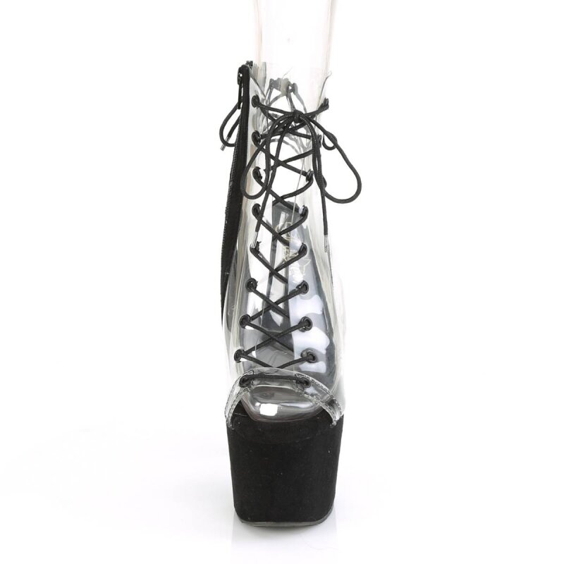 Step up your style with these Pleaser platform ankle boots, featuring a bold open-toe and open-heel design. The lace-up back adds a trendy touch, while the faux suede upper in transparent black creates a sleek, modern look. With a 17.8 cm stiletto heel and a 7 cm platform, these boots provide both height and stability. Perfect for making a statement!