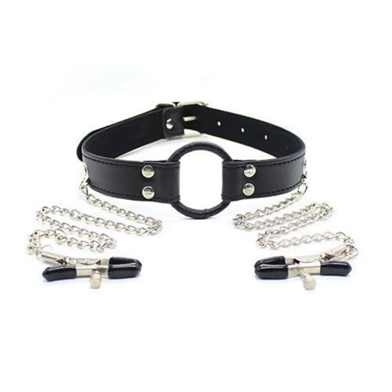 Vegan leather ring-shaped gag and nipple clamps attached to the gag with metal chains.